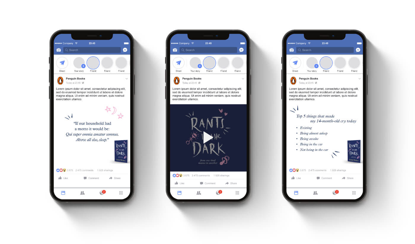 I worked with Penguin Books to put together a digital launch for a new book - Rants in the Dark by Emily Writes. The launch included digital advertising and general website and social content. The cover art and content of the book were the only resources to pull from, but Emily's writing did all the hard work!
